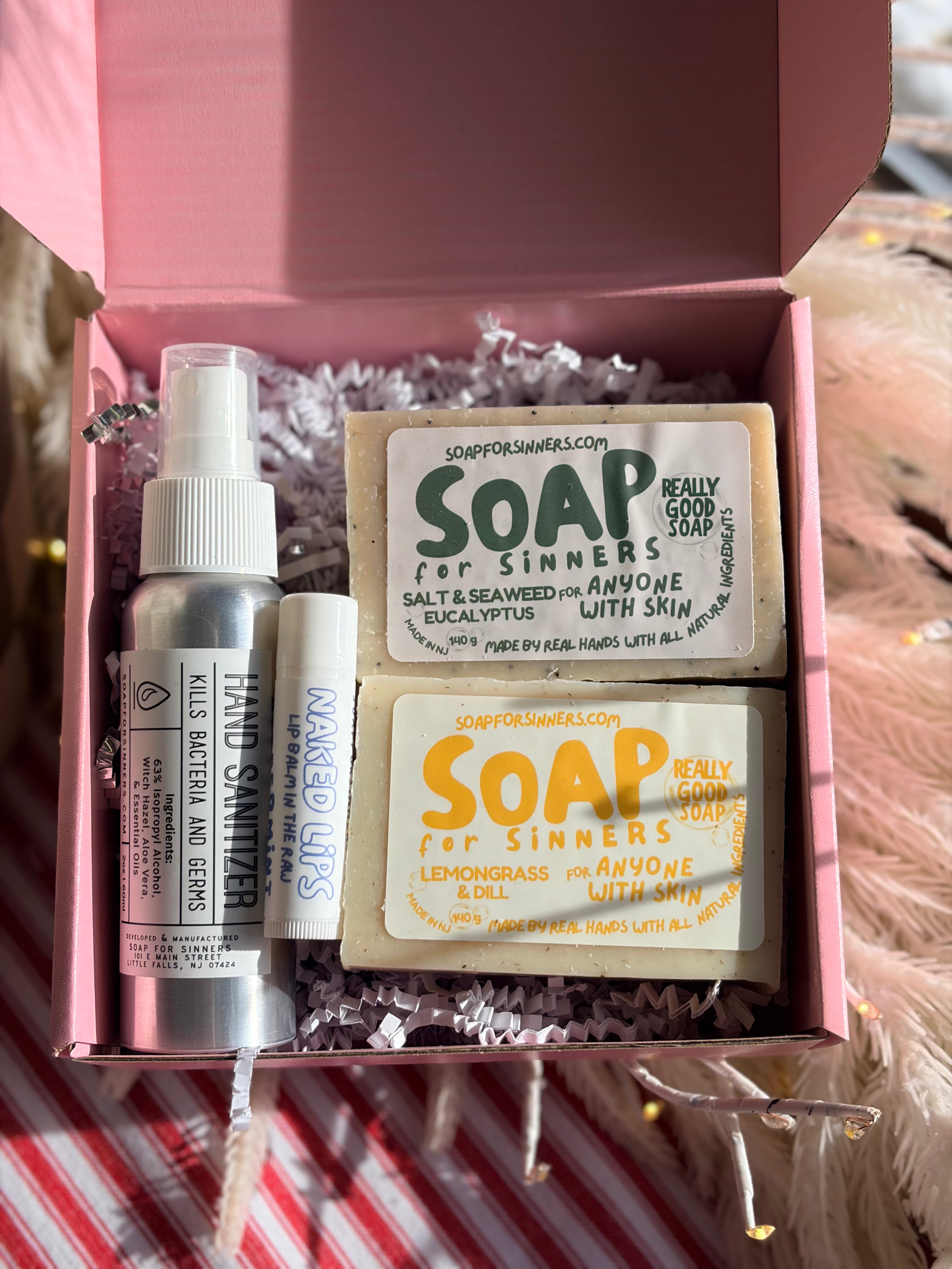 This gift box includes two all-natural, plant-based soap bars, one hand sanitizer, and one lip balm—simple essentials for clean, hydrated skin. Packaged and ready to gift.