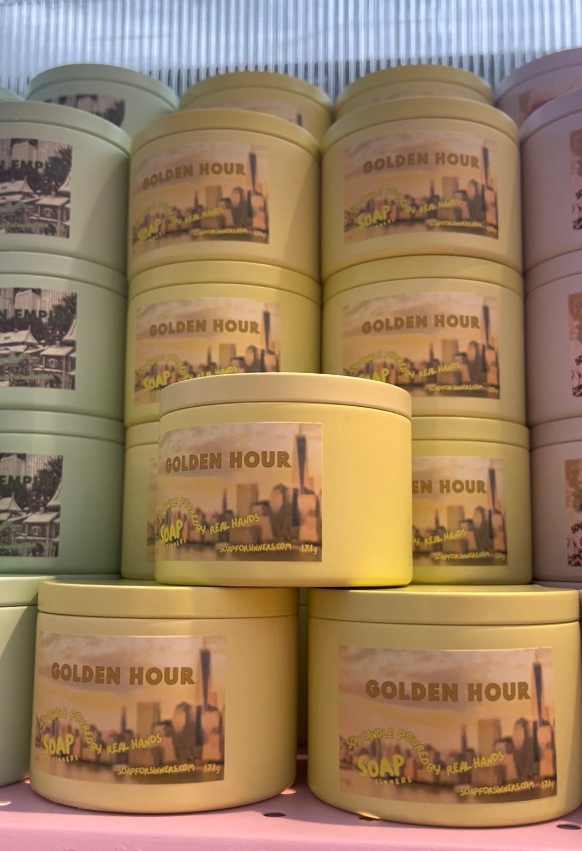 Warm and radiant, blending soft spice, subtle citrus, and a smooth, amber-like warmth. It’s glow-in-a-tin: sunlit, cozy, and softly luxurious.